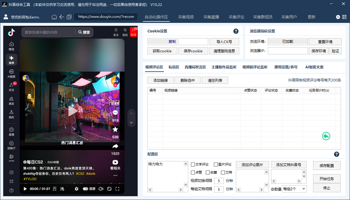 5.视频新评论监听(可设置关键词评论内容监听):导入视频链接开启监听,现在有很多在抖音投流的(巨量广告,付费推广的),把视频链接给复制到软件监测,如果有客户评论,可立即采集他的信息,实时去监测每个视频的最新评论,然后批量自动化评论楼中楼。
