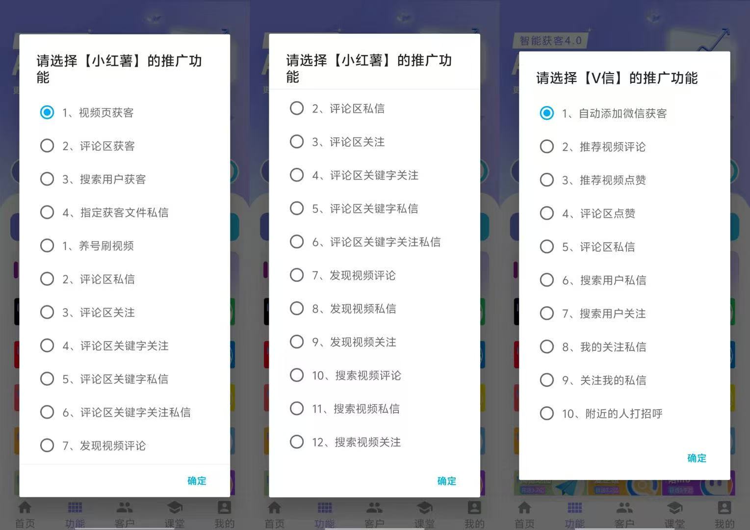 【AI获客5.0】是一款安装在安卓Android/鸿蒙HarmonyOS手机上运行的引流获客软件,支持真机,模拟器,云手机环境下运行。目前支持获客的平台有抖音/快手/小红书/知乎/今日头条/哔哩哔哩/微信/QQ/闲鱼/微博/优酷/百度/百度贴吧/西瓜视频/陌陌/探探/soul/好看视频/豆瓣/爱奇艺/腾讯视频/芒果TV/美团/拼多多/饿了么/搜狐视频等30+主流平台的180多种引流截留采集获客功能,主要功能有采集、养号、同城采集、关注、私信、截留、留痕。模拟人工操作,解放双手 提高工作效率。