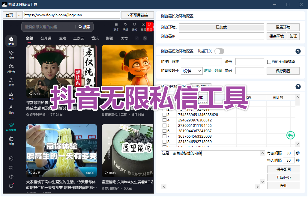 抖音无限私信软件需搭配抖音综合截流软件使用,先用抖音综合截流软件采集需要私信的精准用户UID,将采集好的UID导出至excel格式,后将导出的excel导入至无限私信软件,无限私信软件会根据导入的精准用户UID去进行批量私信。(软件特点为可以精准私信你想私信的用户)