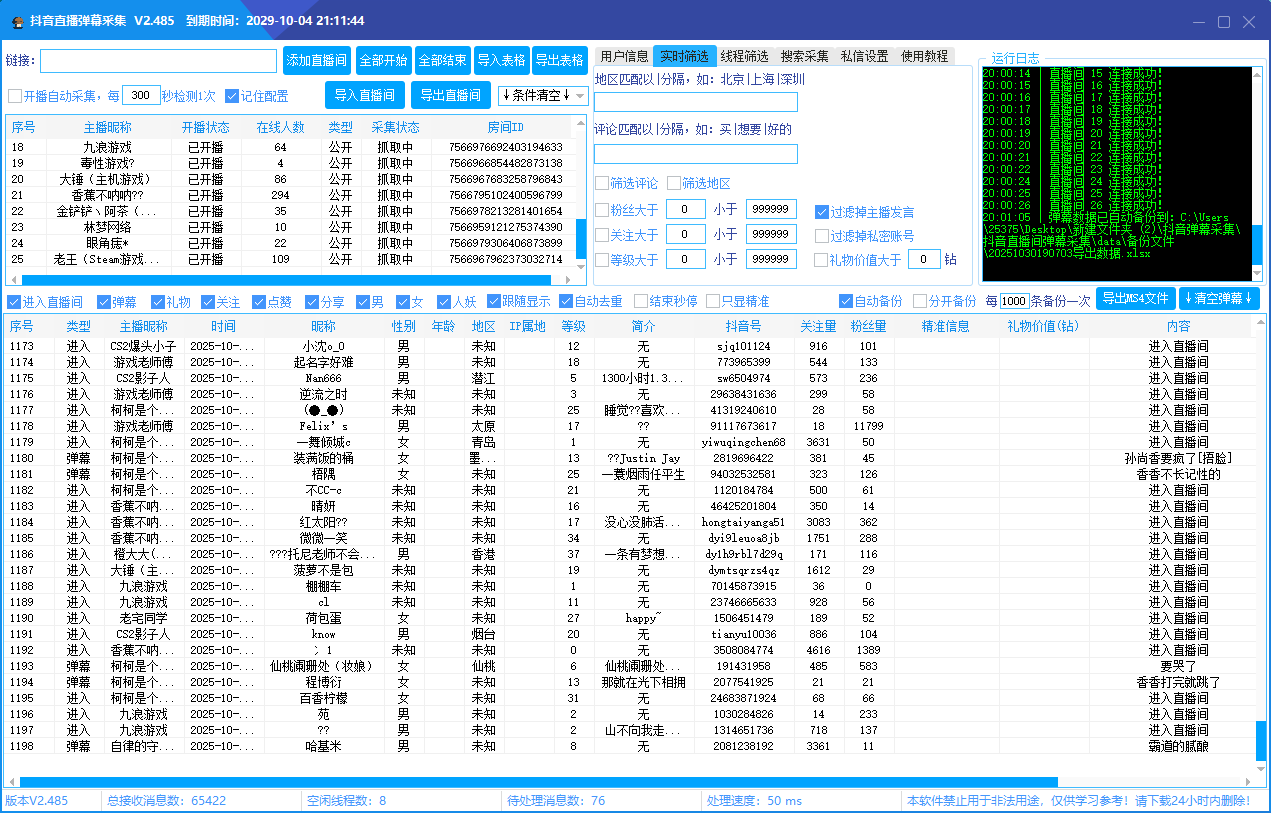 - 采集用户在直播间的各类行为数据:包括进入直播间、发弹幕、送礼、关注、点赞、分享等,同步获取用户昵称、性别、年龄、地区、IP 属地、等级、简介、抖音号、关注量、粉丝量,甚至可秒出手机号,为私域获客提供精准线索。