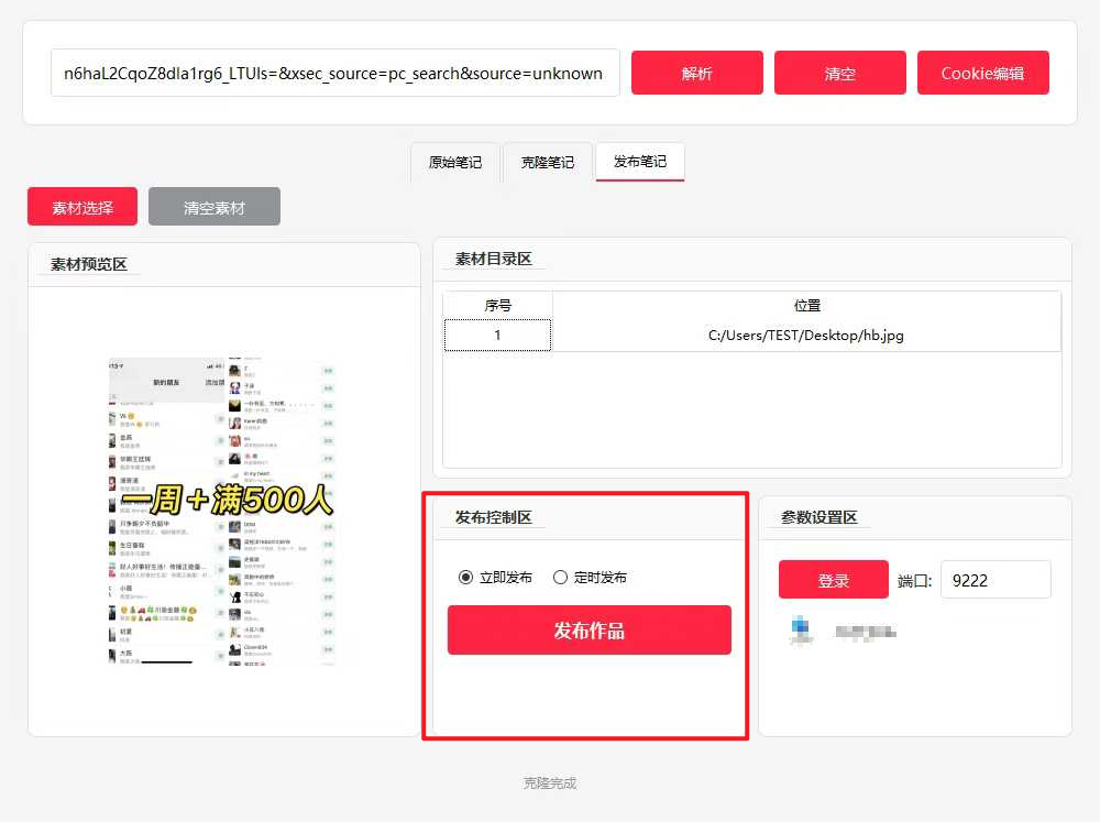 发布控制:提供 立即发布 和 定时发布 两种模式,灵活适配小红书流量高峰时段,最大化笔记曝光率。