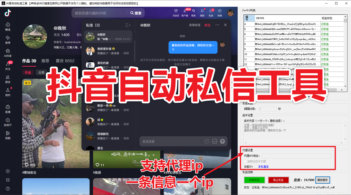 在当下竞争激烈的短视频赛道,如何高效触达潜在粉丝并实现精准引流成为许多创作者与商家的痛点。手动私信不仅耗时耗力,还难以应对平台规则变化带来的风险。而这款「抖音自动私信工具」的出现,为解决这一难题提供了智能化方案。其核心亮点在于通过自动化流程配合代理IP技术,实现了大规模私信发送的同时规避账号风险,让私域流量运营效率大幅提升。