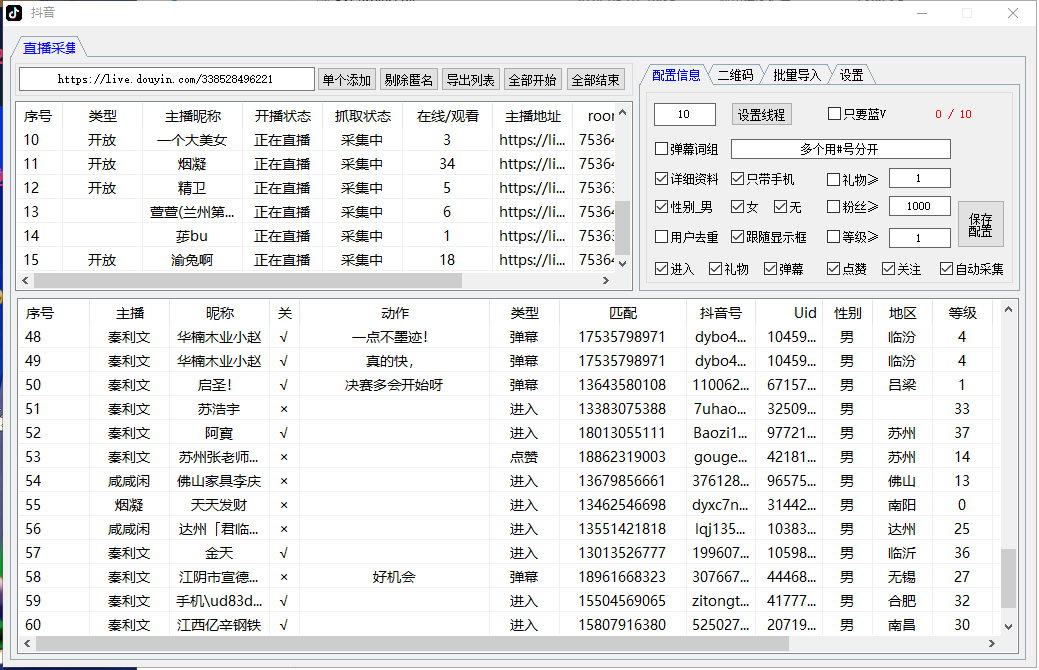1.多直播间连接采集:支持单个添加和批量导入直播间链接。